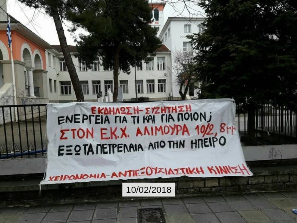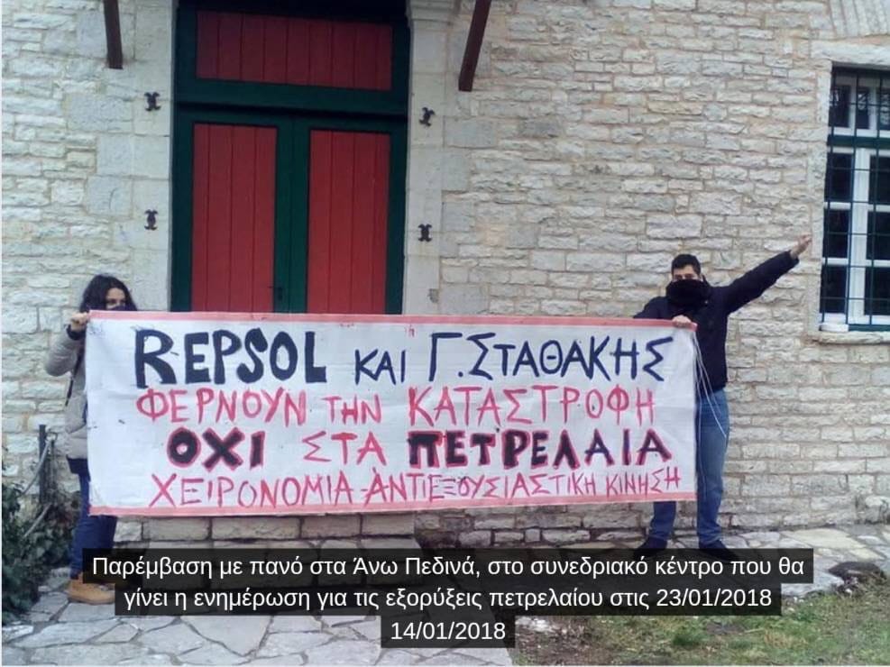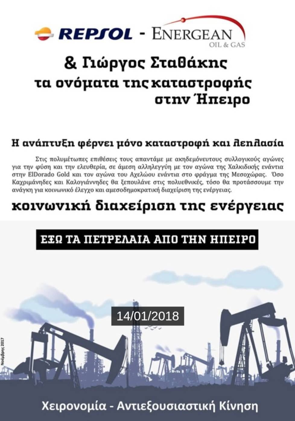 Δεν ξεχνάμε, όμως, και τους ντόπιους καλοθελητές. Τον περιφερειάρχη Καχριμάνη, τον δήμαρχο Ζίτσας Πλιάκο, τον δήμαρχο Πωγωνίου Καψάλη και όλους τους υπόλοιπους παρατρεχάμενους που έσπευσαν να καλωσορίσουν και να διευκολύνουν με κάθε μέσο τις πετρελαϊκές εταιρείες που εμφανίστηκαν στον τόπο μας ως ευεργέτες/αποικιοκράτες επενδυτές που έρχονται να σώσουν τους ντόπιους από την πείνα και την κακομοιριά. Δεν ξεχνάμε την εθελοδουλία τους ούτε την αντιδραστική τους τοποθέτηση απέναντι στις τοπικές κοινωνίες που αντιδρούσαν σθεναρά. Γνωρίζουμε ότι έτσι θα συνεχίσουν να δρουν μπροστά στον κάθε επενδυτή και γι’ αυτό θα μας βρίσκουν σταθερά μπροστά τους…