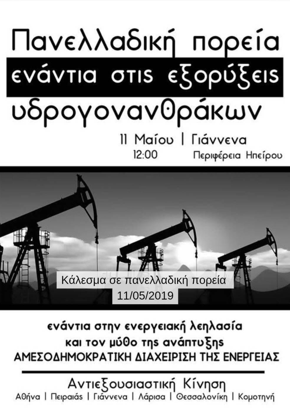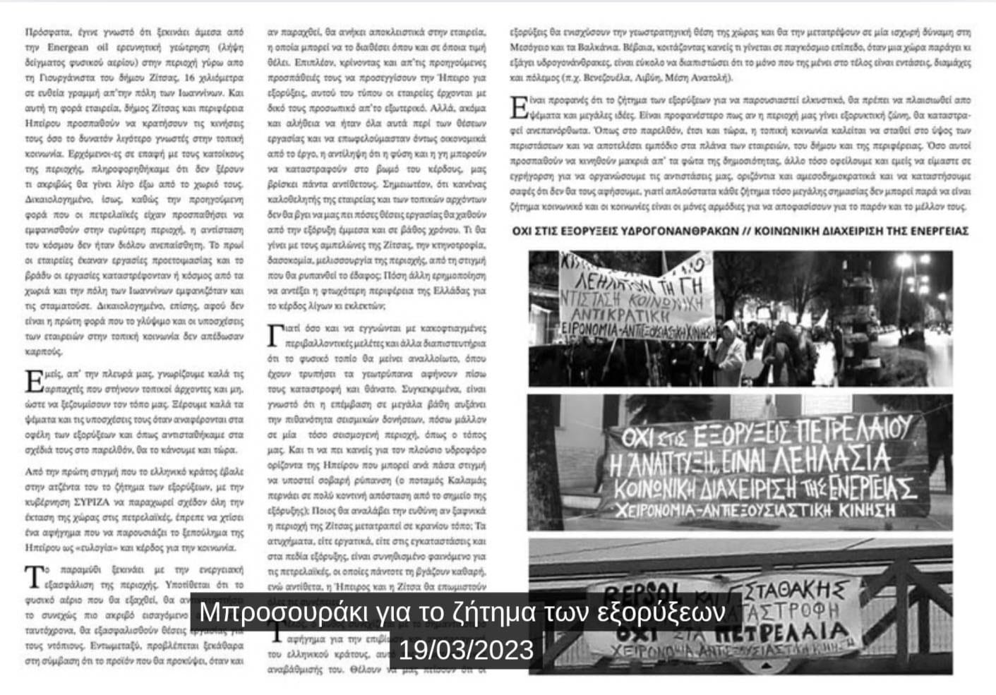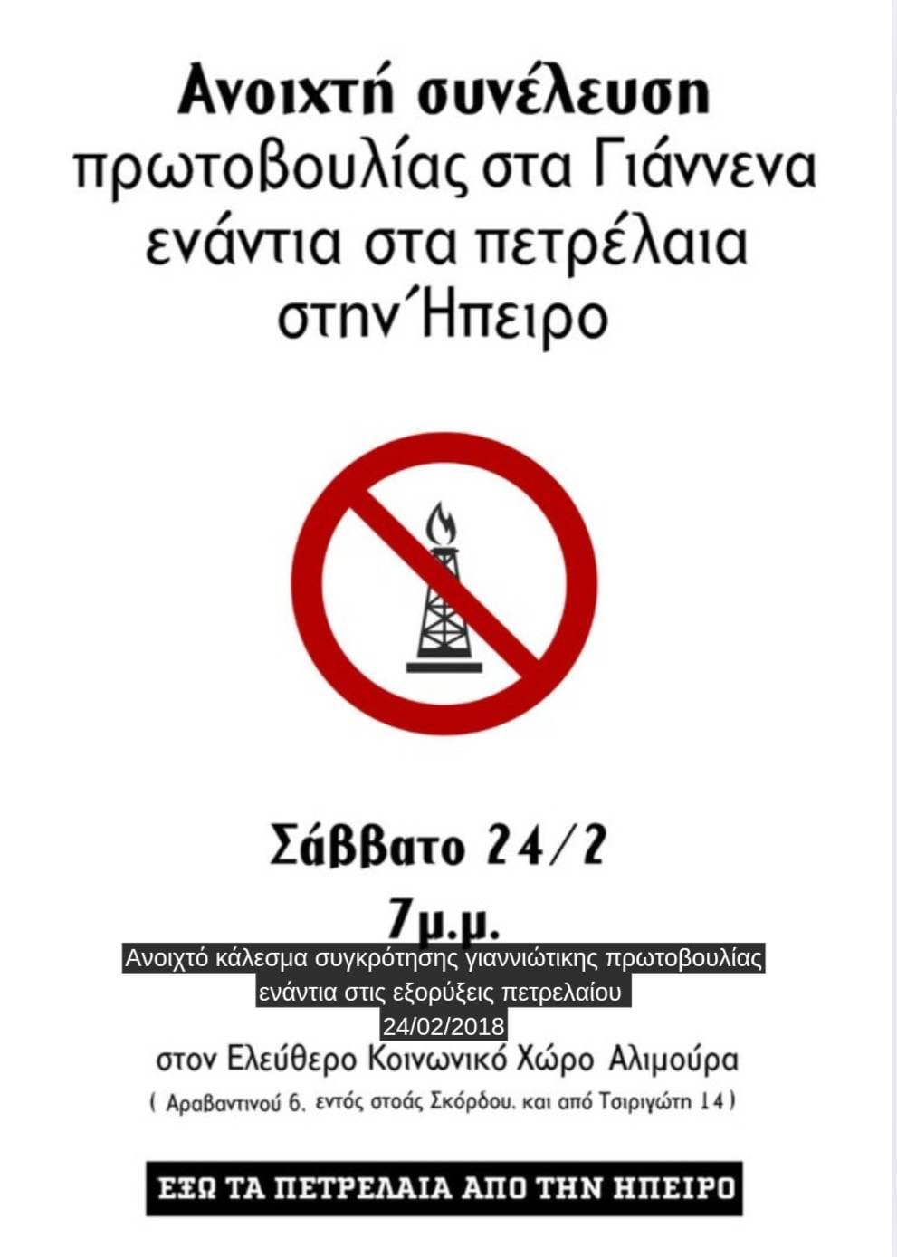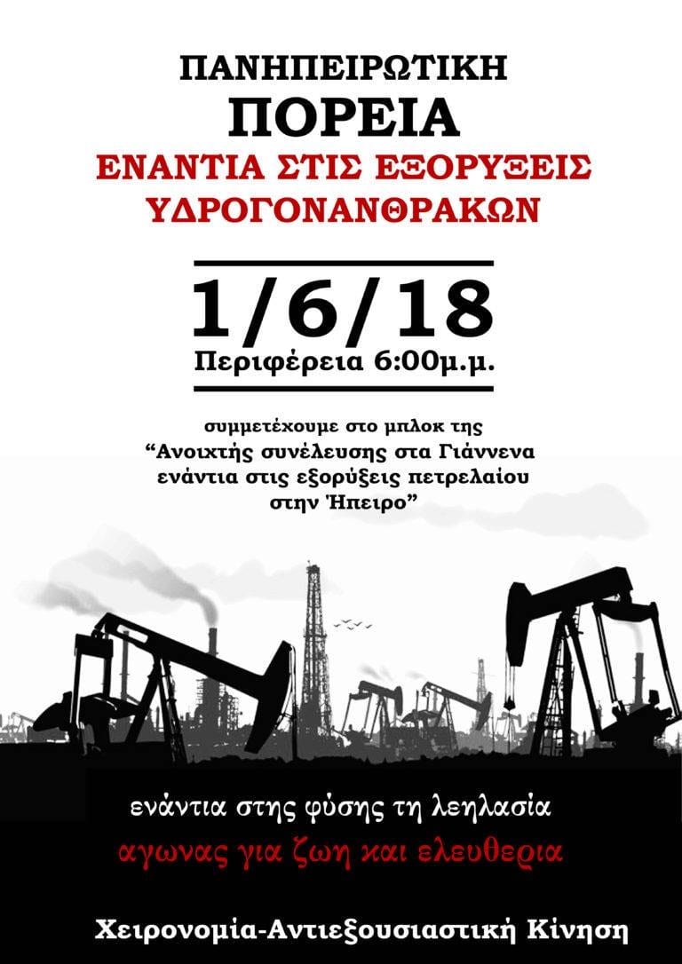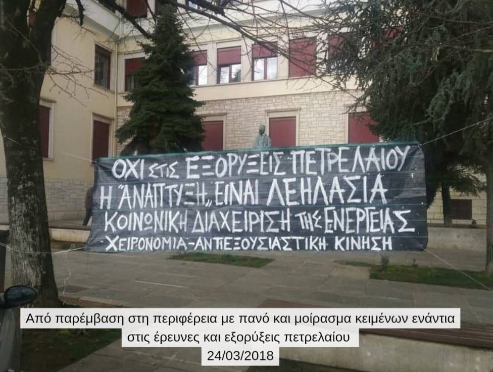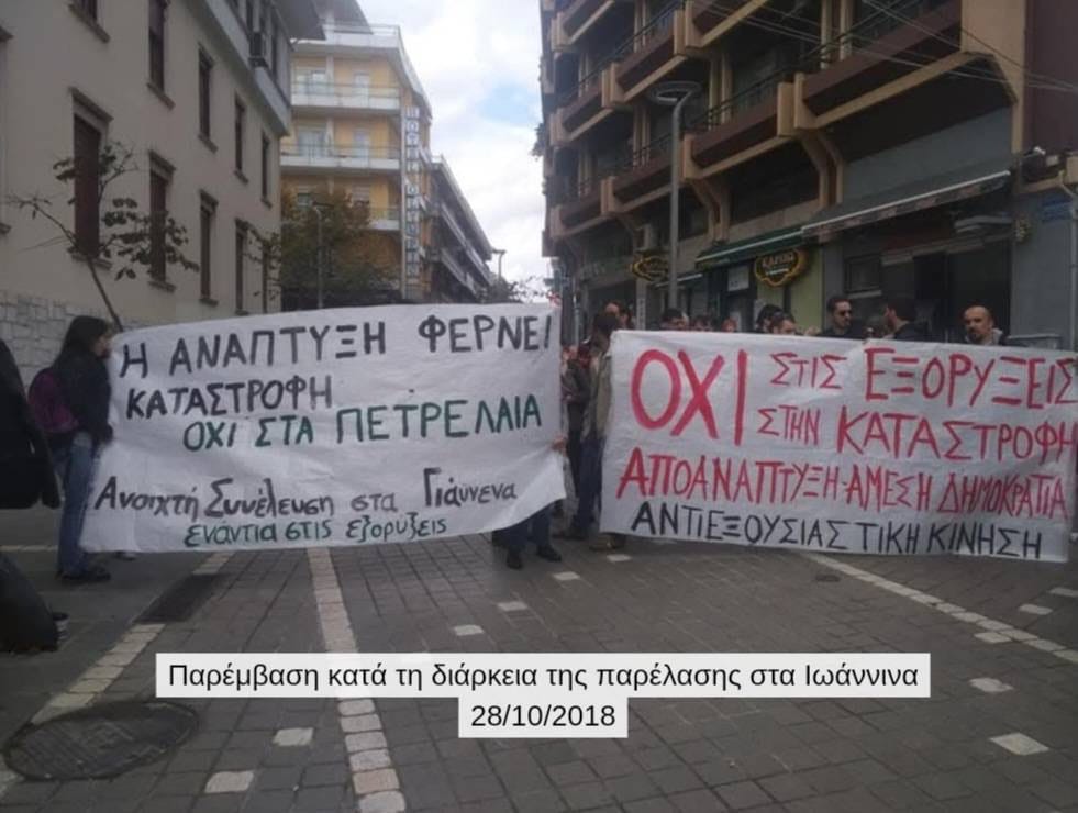 Από τον Σεπτέμβριο του 2017, περίοδο κατά την οποία τέθηκε σε εφαρμογή η σύμβαση παραχώρησης του «οικοπέδου» Ιωαννίνων από τον νεοφιλελεύθερο Υπουργό Ενέργειας του ΣΥΡΙΖΑ Γιώργο Σταθάκη προς τις εταιρείες Repsol και Energean oil and gas, η οποία είχε υπογραφεί το 2014 επί κυβέρνησης Σαμαρά, ως συνέλευση που δραστηριοποιείται στην περιοχή των Ιωαννίνων ήμασταν κομμάτι του κοινωνικού και αδιαμεσολάβητου κινήματος που επιχείρησε να σταθεί εμπόδιο στις ορέξεις των πολυεθνικών πετρελαϊκών εταιρειών. Από τις πρώτες παρεμβάσεις στην πόλη των Ιωαννίνων, στις λαϊκές συνελεύσεις στα χωριά της Ζίτσας και του Ζαγορίου, στα δημοτικά συμβούλια και στις «ενημερωτικές», κατόπιν εορτής, ημερίδες του Υπουργείου στα Άνω Πεδινά κι από κει στη δημιουργία της Ανοιχτής Συνέλευσης ενάντια στις εξορύξεις υδρογονανθράκων και έπειτα στο κατόπι των εταιρειών στα βουνά και στις μεγαλειώδεις και πρωτόφαντες πορείες ενάντια στις εξορύξεις στα Ιωάννινα και στην Αθήνα. Με παρεμβάσεις, αμέτρητες συνελεύσεις και συντονισμούς, συμμετοχή σε πορείες και εκδηλώσεις σε άλλες πόλεις και χωριά με σκοπό την ενίσχυση του τοπικού αγώνα και της αλληλεγγύης μεταξύ των κινημάτων ενάντια στη λεηλασία της φύσης και των τόπων μας.