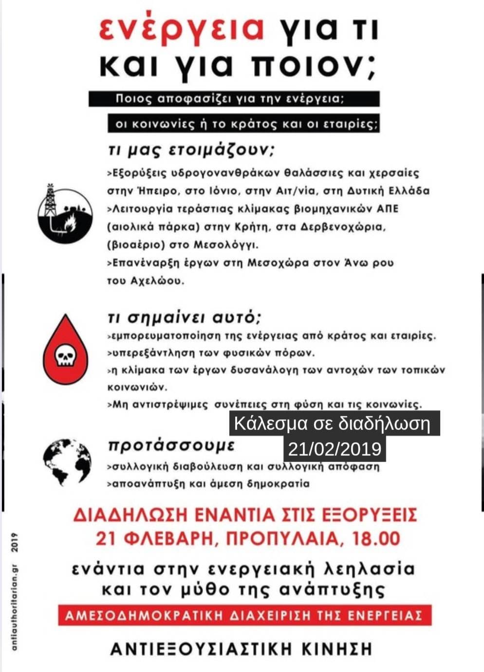 Με πείσμα και συνέπεια θα συνεχίσουμε να βαδίζουμε στον αγώνα για την κοινωνική διαχείριση της ενέργειας και των κοινών αγαθών, μαζί με τις τοπικές κοινωνίες και τους ανθρώπους που αρνούνται να υποταχθούν στην επέλαση της βαρβαρότητας και της μετατροπής κάθε σπιθαμής γης σε γρανάζι του καπιταλιστικού τέρατος.