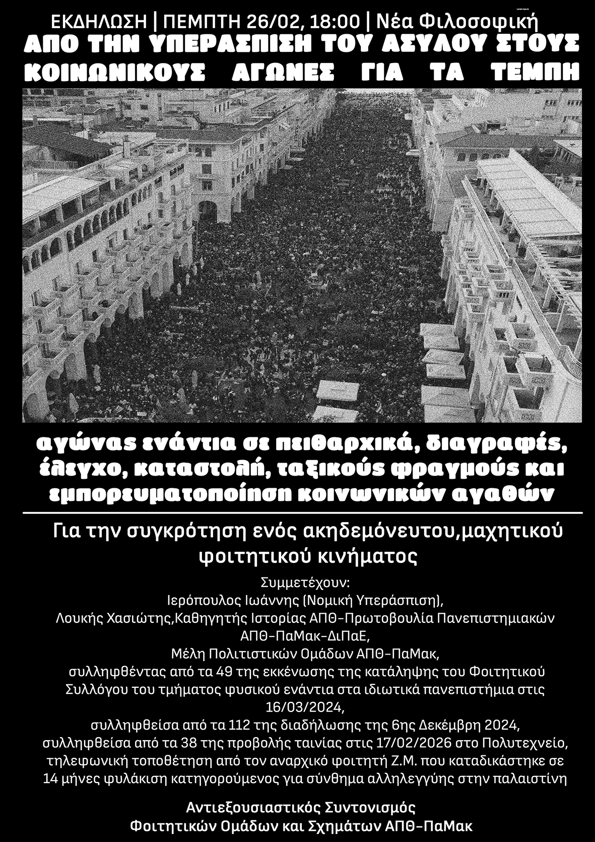 Από την υπεράσπιση του ασύλου έως τους κοινωνικούς αγώνες για τα Τέμπη: ο αγώνας μας είναι κοινός για την προάσπιση της ζωής,της αξιοπρέπειας και της ελευθερίας.